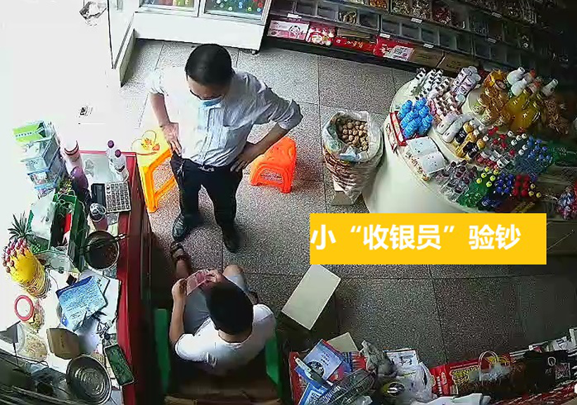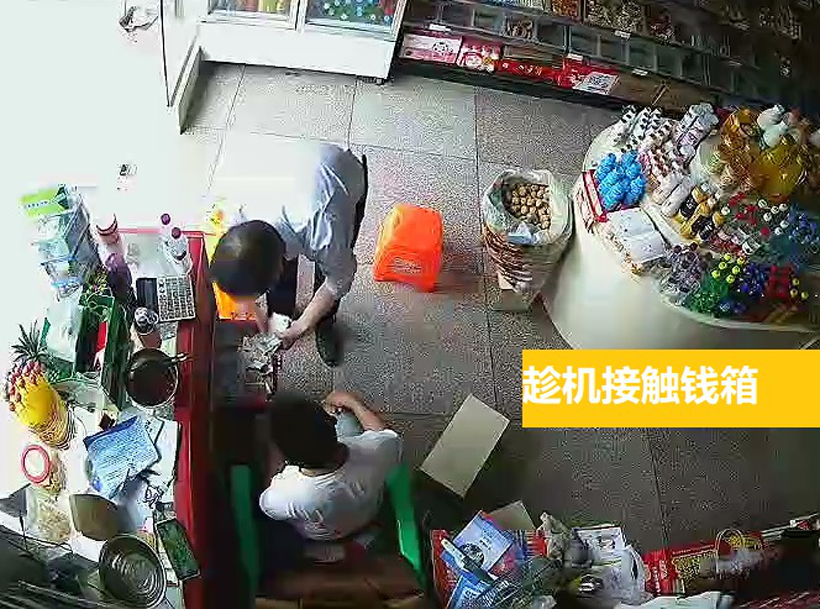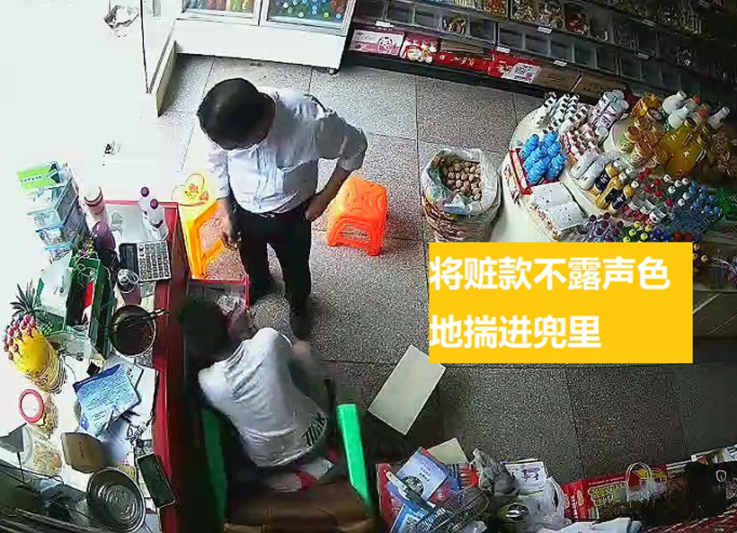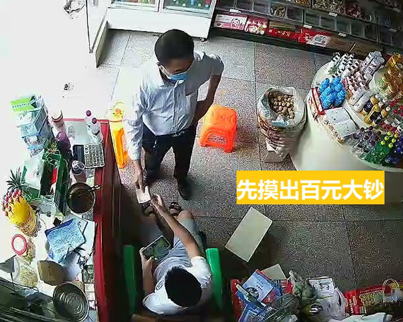 在调取超市内的监控后,张某发现当天有一名男性顾客到超市买了两瓶饮料,然后到收银台摸出了一张百元大钞让孩子找零。“他手伸进过收银箱里。”张先生注意到,在孩子给他找零的过程中,该男子的行迹十分可疑,遂立即向辖区派出所报警。