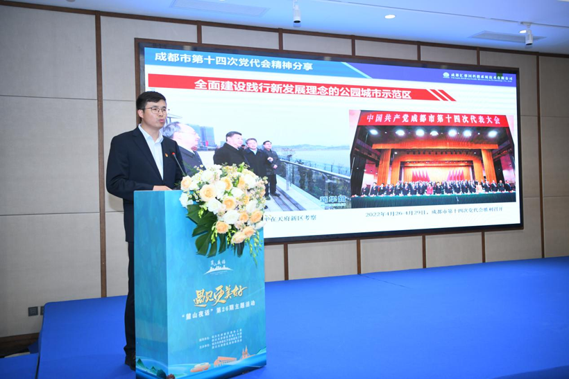 在近2小时的活动中,成都市委党校教授陈藻解读了成都市第十四次党代会的精神。她称:成都市第十四次党代会,是在成都奋进新时代,迈进新征程中的一次重要会议。通过解读,与会人员对成都下一个五年宏伟目标满怀激情和期待。2018年2月11日习近平总书记视察天府新区时,提出73个字要求。四年来,天府新区牢记嘱托,全力打造山水人城和谐相融的公园城市。当晚,以习总书记视察天府新区为主题的全新原创制作沙画表演,赢得阵阵掌声。同时,出席成都市第十四次党代会的党代表汪宗福分享了党代会精神。同时,新区政协委员代表谭啸、匡雄、欧阳峥峥、施文忠分别就如何提升金融投资服务、高效为科创投产业赋能、如何做好科技要素与新区发展融合、在世界文化名城彰显新魅力背景下、如何体现人文价值作交流分享。活动最后,天府新区政协工委主任袁旭作发言。他称:2022年是天府新区“核心功能提升年”,也是新区政协工委成立第一年。并寄语政协委员:增强大局观念、提升政治能力、强化使命担当、弘扬务实作风、为天府新区全面建设践行新发展理念的公园城市先行区凝聚共识、汇聚力量。