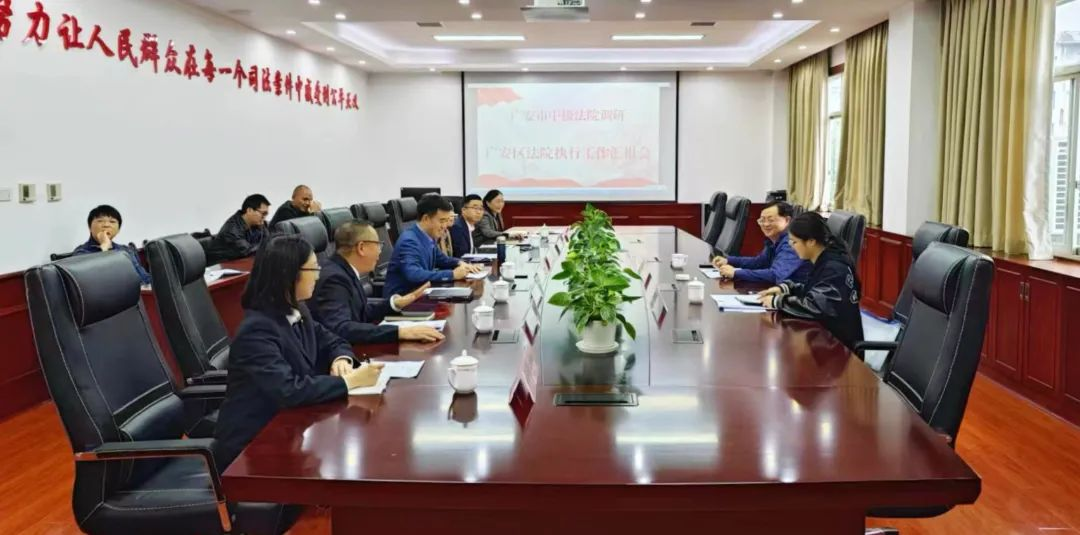近日,广安中院党组成员、执行局局长黄建武一行到广安区法院调研指导执行工作并召开座谈会。区法院党组成员、院长张凡平,党组成员、执行局局长陈晓斌,审判委员会专委张勤及执行局全体法官干警参加座谈。黄建武听取区法院执行工作情况汇报并就四季度执行工作提出要求:一…